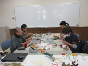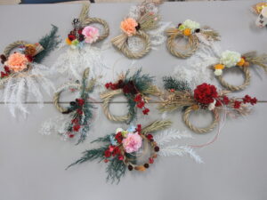 クリスマス・正月用のリースとして、あらかじめ編んであるしめ縄リースに、造花やドライフラワーなどの装飾を施しました。それぞれ好きな装飾品を選び、リースの間に入れ込んだり、貼り付けたりしながら思い思いの作品を作りました。