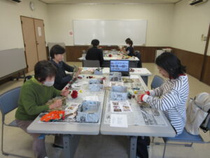 クリスマス・正月用のリースとして、あらかじめ編んであるしめ縄リースに、造花やドライフラワーなどの装飾を施しました。それぞれ好きな装飾品を選び、リースの間に入れ込んだり、貼り付けたりしながら思い思いの作品を作りました。
